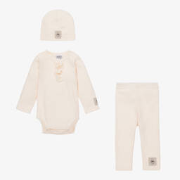 Dusky pink babysuit set for girls by Polish brand Jamiks, made in comfortable, ribbed cotton jersey. The bodysuit has a pretty ruffe on the front and picot trims, with popper fastenings on one shoulder and between the legs, so it always stays tucked in and tidy. The trousers have a comfortable, elasticated waistband and are easy to wear, simply pulling up. All pieces of the set have the designer's logo patch sewn on one side.