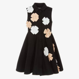 Ivory sleeveless dress for girls by Jessie and James London showcases exquisite floral appliqués for an enchanting appearance. Crafted from a soft cotton and viscose blend twill, its elegant fit and flare silhouette is enhanced by a pointed collar and covered button fastenings. A subtle metal logo tab adds a touch of luxury, while the lightweight cotton lining ensures comfort. Perfect for special occasions, this dress is available in limited quantities, offering a last chance to buy this stunning piece.