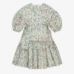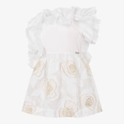 Girls ivory dress from Jessie and James London, with a colourful floral pattern overlaid with white embroidered flowers. It has a fitted bodice and cold-shoulder detail on the ruffle sleeves. A beautiful, symmetrical side frill travels down from the shoulder to the waist, then twists into a peplum that finishes at the centre back. It is made in a silky viscose blend, with ivory trims in soft cotton. Fully lined in cotton voile, it fastens with a concealed zip and button on the back.