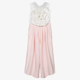 A charming pink and white jumpsuit for girls by Junona captures the essence of elegance with its exquisite design. Featuring a striking 3D flower on the bodice and wide pleated legs, it offers a perfect blend of style and comfort. This fully lined piece includes a back zip for easy dressing, making it ideal for special occasions. Limited quantities available, so don't miss out on this sophisticated addition to their wardrobe.