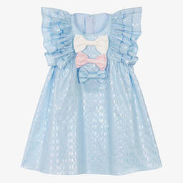 A pretty white dress for little girls by Junona. The smooth cotton fabric has a colourful iridescent logo print, ruffled flutter sleeves, and a trio of pastel-coloured bows on the front. There is a concealed zip fastening on the back and it is fully lined for comfort.