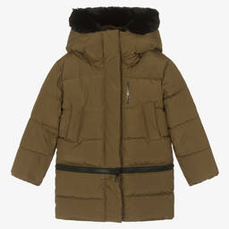 Cool, cosy khaki green puffer coat for teen girls by KARL LAGERFELD KIDS, with shiny black logo prints on the front and back for instant brand recognition. Soft and smooth, it has a silky black lining has a tonal jacquard Karl Kameo logo for an added designer touch. The black, faux fur trim on the hood is secured with poppers and can be removed, as can the bottom panel that is secured with an exposed zip, to create a jacket, allowing multiple looks in one.