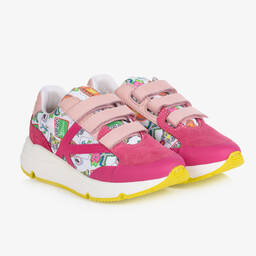 Colourful blue and orange velcro trainers for boys and girls by KENZO KIDS. The bold uppers comprise orange and blue panels in soft leather and suede respectively. There are white trims on the sides patterned in travel-themed prints and an embossed logo on the heel. They are finished with a cushioned insole and a sporty non-slip rubber sole.