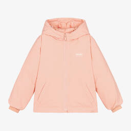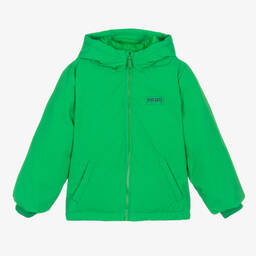 Vibrant green hooded puffer jacket for boys and girls from KENZO KIDS. For instant designer recognition, it has the luxury French brand's Kenzo Paris logo printed in navy blue on the front and back, and a branded zip fastening. Warmly padded in soft down, it has a silky smooth and water-repellent exterior and a satin lining. For added cosy wear, the jacket has soft ribbed cuffs, fleece-lined pockets and a toggle-adjustable hem.