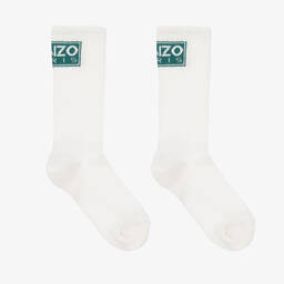 Navy blue long socks for boys and girls by KENZO KIDS, with a blue and white jacquard logo on the back. These stretchy ribbed socks are made from a soft and comfortable cotton rich blend.