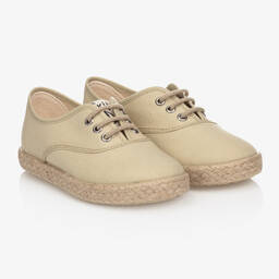 Blue cotton canvas espadrille trainers for boys and girls by KIKU, with comfortable, lightly padded insole. These lace-up trainers have braided hessian trims around the non-slip rubber outsole.