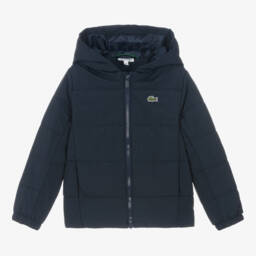 Boys black puffer jacket by Lacoste, made in smooth nylon and designed to repel water. It has a high funnel neck, zip fastening, and functional front pockets. There is an iconic, embroidered logo on the chest teamed with a stylish designer graphic printed on the back in white.