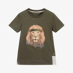 Boys blue jersey T-shirt by Lapin House, with a beige 'King of the Jungle' lion print. The smaller sizes have shoulder poppers.
