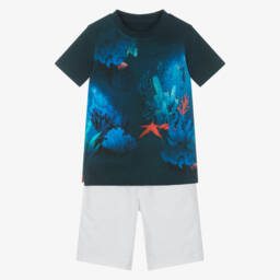 Boys blue ocean-themed top and white shorts set by Lapin House features a vibrant underwater print on the top, capturing the stunning beauty of coral reefs and aquatic life. The soft and lightweight fabric ensures comfort, while the crisp white shorts offer a relaxed fit with an elasticated waistband for easy wear. Perfect for warm spring and summer days, this outfit is a stylish choice for casual outings or special occasions. Limited quantities available, so secure this unique set today.