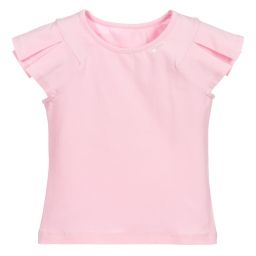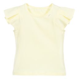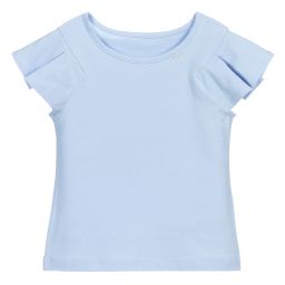 Girls blue T-shirt by Lapin House made in soft and stretchy cotton jersey. It has ruffle sleeves and a silver logo print on the neckline.