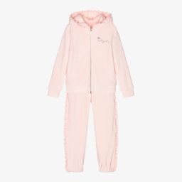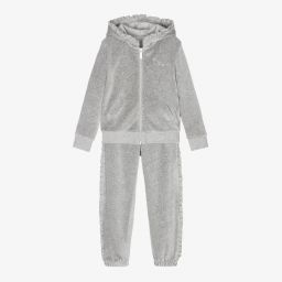 Navy blue tracksuit for girls from Lapin House, made from soft cotton velour with pretty ruffle trims. The hooded top has a silver branded zip fastening, a glittery silver 'Style' print and front pockets. The joggers have a gently elasticated waistband and ankle cuffs.