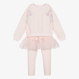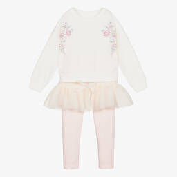 Ivory leggings set for girls by Lapin House, made in soft cotton jersey with a touch of silk. The pretty top has pink and green flowers printed on the front, sparkling with diamantés, and a gathered, ivory tulle hem with a grosgrain ribbon drawstring tie. Casual and comfortable, it has a warm, fleecy inside and cosy ribbed trims, and comes with full length, pink and white houndstooth leggings that have a gently elasticated waistband.