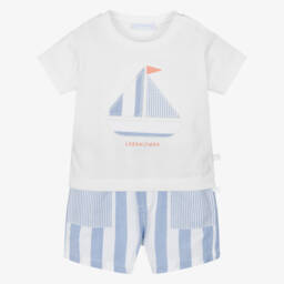 Cute ivory and sage green shorts set for baby boys from Chic by Laranjinha. The ivory linen shirt style bodysuit has a collarless design and poppers between the legs. There are front button fastenings and tabs on the sleeves, so that they can be rolled up and secured in place. The sage green twill shorts have adjustable shoulder straps and front pockets.