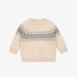 A boys beige and navy top by Laranjinha features a delightful Nordic-inspired pattern. Crafted from a warm wool blend, it offers both comfort and style for chilly days. The ribbed cuffs, hem, and neckline ensure a snug fit, making it an ideal choice for layering during the autumn and winter months. Limited quantities available, so don't miss this last chance to buy a cosy and stylish addition to a young wardrobe.