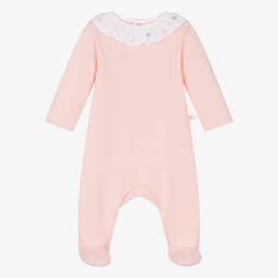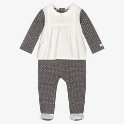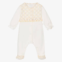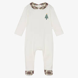 Beautifully soft for baby boys and girls, this green Laranjinha babygrow is made in cosy cotton velour. For a stylish look, it has an ivory muslin collar and a checked panel on the chest with matching patch pockets. Fastening easily with poppers on the front and between the legs, it has decorative branded wooden buttons on the front and a logo tab for a discreet designer finish.