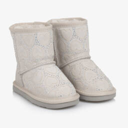 Girls beige suede boots feature a charming heart pattern and sparkling diamanté by Lelli Kelly. Crafted from soft suede leather, these boots have a cosy faux shearling lining and insole, ensuring warmth and comfort. The non-slip rubber outsole adds practicality, making them ideal for winter wear. Easy to slip on, these boots are both stylish and functional, perfect for adding a touch of sparkle to any outfit. Limited quantities available, so grab a pair while you can!