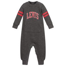 Blue marl hooded romper suit for baby boys by American brand Levi's. Made in lightweight cotton jersey, it has a bold navy blue and white logo along one side with an asymmetric zip fastening in matching colours. One of the front pouch pockets has the designer's navy blue Batwing logo.