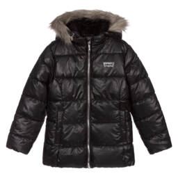 Boys olive green hooded parka coat from Levi's, made in durable and water resistant polyester canvas. Down padded for superior warmth and comfort, the coat is lined in satin and soft fleece. The hood has detachable faux fur trim. There are patch pockets and hand-warmer pockets on the front and a useful internal pocket. The coat fastens with a zip beneath a popper flap and has embroidered logo details on the front and one sleeve.
