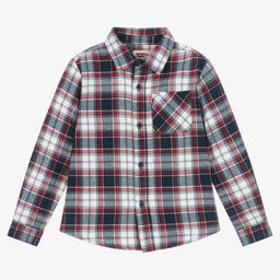 A smart-casual blue check shirt for teen boys by Levi's, featuring a blue and white check pattern. Detailed with the iconic Red Tab on the chest pocket, it includes a pointed collar and ivory button fastenings on the front and cuffs. Made from a soft and lightweight cotton-blended weave, it's comfortable and perfect for everyday wear. Limited quantities available, so it's your last chance to buy this stylish shirt.