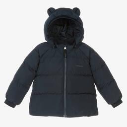 Beige hooded puffer jacket for younger girls and boys by Liewood, made in smooth recycled polyester. Both functional and warm, it is padded with luxurious down and the Bionic Finish® Eco coating ensures it is waterproof, windproof and breathable. The front zip fastening has a useful chin guard and the detachable hood is secured with poppers and has cute ear appliqués. There is a subtle, printed logo on the front.