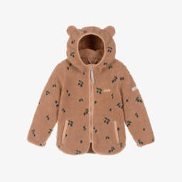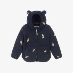 Navy pile jacket for boys by Liewood features playful 3D ears on the hood. Crafted from recycled polyester, this cosy jacket includes a fun rocket motif, perfect for adding a touch of adventure to chilly days. The silky lined hood and handy front pockets enhance comfort and practicality, making it ideal for autumn and winter outings. Limited quantities available, so seize this last chance to buy this delightful piece for your junior explorer.