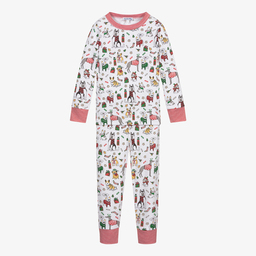Pink long pyjamas for girls by Magnolia Baby, made in super soft and stretchy Pima cotton jersey. They have a cute Christmas themed dog print and red and white striped trims.