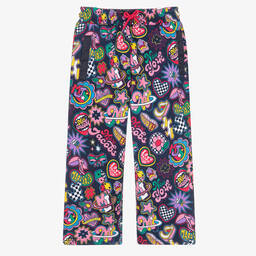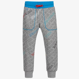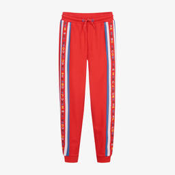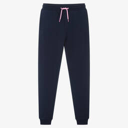 Blue two-tone joggers for teen boys by American designer MARC JACOBS, made in soft, mid-weight cotton jersey. They are designed with convenient side pockets and a printed and embroidered logo on the back. With splashes of vibrant colour, the waist is striped in blue, the cuffs have yellow stripes and the side seams are trimmed with neon-yellow piping. The elasticated waist has green drawstring ties for a good fit.