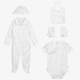 A lovely Pima cotton layette gift set for baby girls by Marie-Chantal, comprising of a hat, babygrow, bodyvest, bib and scratch mitts. All the pieces have a pink and coral star, angel wings and crowns print and white cotton embroidered lace. The cuffs on the babygrow turn over to create integrated scratch mitts. The fit can be quite small, so Marie-Chantal advises you to choose a size up if you want room to grow.