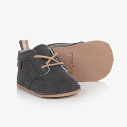 Navy blue pre-walker boots for baby boys by Mayoral, made from soft and supple faux suede leather. This timeless desert boot style has lace fastenings and a striped heel tab on the back. They have a soft cotton jersey lining and insole and a lightly textured outer sole to prevent slipping.