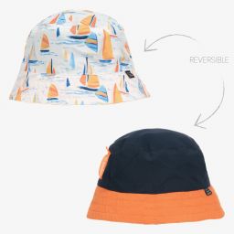 Reversible sun hat for baby boys by Mayoral, in neon green and blue. Soft and lightweight, this bucket-style hat is made in recycled polyester with a fun racquet print on one side, and blue and neon green panels on the reverse. Both sides have a small 'Happy Summer' logo tab and vents for comfort.