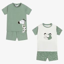Pack of two shorts sets for baby boys by Mayoral Newborn, made in soft sustainable cotton jersey. In red, navy blue and stripes, the tops have cute dog appliqués and the shorts have gently elasticated waistbands.