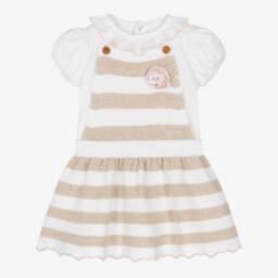 Baby girls pink pinafore dress and bodysuit set by Mayoral Newborn, made with soft cotton. The knitted pink and white stripe pinafore has a cute intarsia cat design with embroidered details and a bow, and there are adjustable shoulder straps with wooden buttons. The white babysuit has puffed, elasticated sleeves and a pink trimmed ruffle collar.