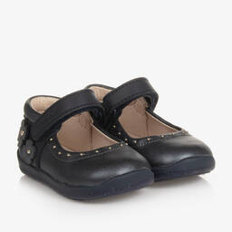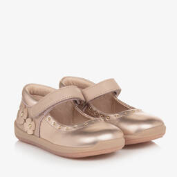 Lustrous metallic gold bar shoes for baby girls by Spanish brand Mayoral, made and lined in soft, supple leather. They have gold studs around the front and on the floral appliqués on the ankles. The back is made in matte leather, with an embossed logo on the strap. Comfortable and sturdy, they have a cushioned insole and a sparkly, rubber, non-slip outer sole.