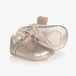 Adorable pink pre-walker shoes for baby girls from Mayoral with a lovely pearly sheen. Made in flexible faux leather with rubber grips on the soles, they have an adjustable velcro-fastening strap for a secure fit. Pretty cut-out detail across the front and a large tonal satin bow on the strap give a beautiful finish.