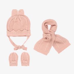 Beige hat, scarf and gloves set for baby girls, by Mayoral Newborn. Made from soft knitted cotton with a pretty gold shimmer, the hat has cable knit detail with a pretty bow on the top. It comes with a cute matching cable knit scarf and mittens.