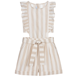 A striped black and white playsuit for girls by Mayoral. Made in a soft, lightweight blend of cotton and linen, it also has a sparkly silver thread. There are ruffled trims and an open waist. The shorts have an elasticated waist, with a fixed tie belt on the front and a zip fastening on the back.