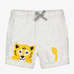 Little boys comfortable blue cotton jersey shorts, with a cute beige and white fox cub appliqué by Mayoral. Super soft and stretchy, they have a useful black and white drawstring waistband and fixed turn-ups. There are concealed side pockets and a blue and ivory striped patch pocket on the back.