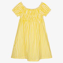 Blue and white striped dress for girls by Mayoral, made in lightweight cotton. It has a gathered, elasticated neckline with pretty puffed sleeves that can be worn off the shoulders. The bodice and cuffs have elasticated gathers that match the neckline. Easy to wear, it simply pulls on.
