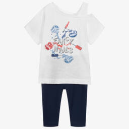 White and navy blue top and leggings set for girls by Mayoral, made in soft and stretchy cotton jersey. The white top has a cut out shoulder on one side and a colourful nail varnish print on the front with silver glitter and diamanté stud details. The navy blue leggings are cropped and have a gently elasticated waistband.