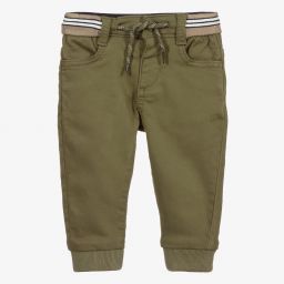 Beige jogger-style trousers for younger boys by Mayoral, made in soft and stretchy cotton. They have a striped ribbed waistband with a popper fastening and a drawstring tie. There are pockets on the front and back and the trousers have soft ribbed ankle cuffs.