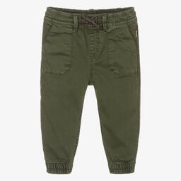 Beige trousers for little boys by Mayoral, woven in soft sustainable cotton. In a comfortable jogger style, they have an elasticated drawstring waistband and elasticated ankle cuffs. There are two pockets on the front and one on the back.