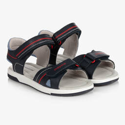 Boys blue ad white sandals by Mayoral, with a logo print on the front. Made in soft leather with a comfortable jersey lining, they have padded leather insoles and flexible non-slip outsoles. The sandals fasten with velcro straps for ease and have green textile trim with a blue logo plate on the heel.