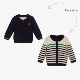 Reversible zip-up top for little boys by Mayoral, knitted in soft cotton. One side is solid red, with navy blue trim and stripes on the cuffs. It has front pockets and a leather logo badge on the chest. The other side is navy blue, with red and beige stripes.