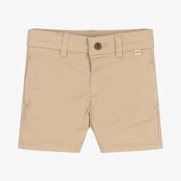 Boys khaki cotton shorts by Mayoral are crafted from sustainable cotton, featuring a button fastening and adjustable waist for a perfect fit. These shorts have concealed side pockets and buttoned back pockets, ideal for casual wear during the spring and summer months. Limited quantities available, so don't miss your last chance to buy these stylish and practical shorts.