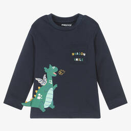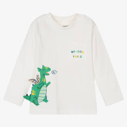 Ivory long-sleeve t-shirt for little boys by Mayoral, made from soft and stretchy cotton jersey. This sweet top has a green dragon printed on the front, with appliquéd wings and a tail. The front pocket has a 'dragon smile' print, and one shoulder has popper fastenings for convenient changing.