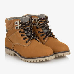 Khaki green leather boots for boys by Mayoral, designed in the style of hiking boots. Lined in a navy blue wool blend, they fasten with bright orange laces on the front alongside practical side zips and velcro tabs for easy wear. They come with a pair of green interchangeable laces and have non-slip rubber outsoles for good grip.