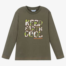 Casual for everyday, this navy blue long-sleeved top for boys is by Mayoral. Made in soft, sustainable cotton jersey, it has 'Keep Earth Cool' ecological slogan printed in blue, ivory and green on the front. The neon green stitching adds contrast to this design.