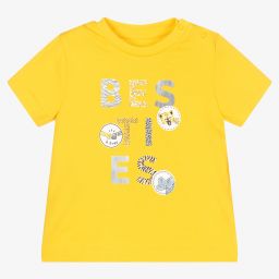 Off-white T-shirt for little boys by Mayoral, made in soft sustainable cotton jersey. It has a fun wild animal print on the front, with the word 'Besties' in blue and orange. There are useful popper fastenings on the shoulder.