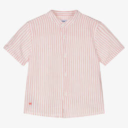 Casual pale yellow shirt for little boys by Spanish brand Mayoral, made in a comfortable lightweight cotton and linen blend. Collarless, it has fixed turn-up cuffs and fastens with little white buttons on the front.