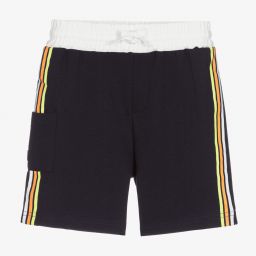 Bright yellow shorts for boys by Mayoral, made in soft and stretchy cotton sweatshirt jersey. They have a white drawstring waistband and stripes down the sides in black, beige and neon orange. They have a pocket on the back and one on the leg trimmed with a rubberised logo patch.